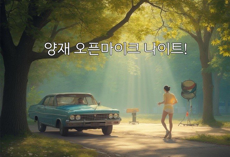 **양재 오픈마이크 나이트 소개**양재 오픈마이크 나이트는 매주 한 번 열리는 곳으로, 아마추어나 프로페셔널 모두가 참여할 수 있는 공연의 자리를 제공해줍니다. 이 이벤트는 다양한 장르의 음악, 스탠드업 코미디,